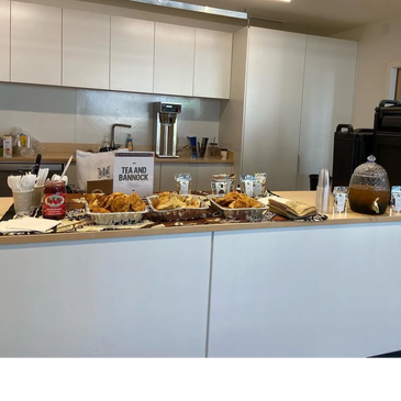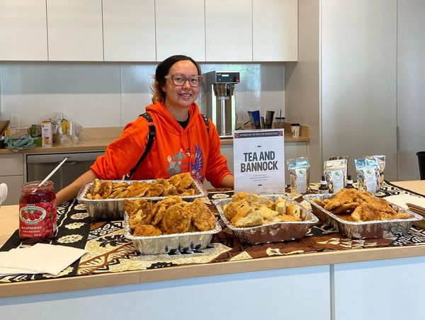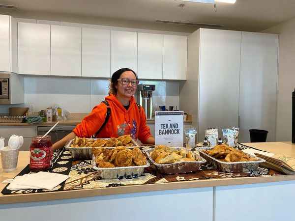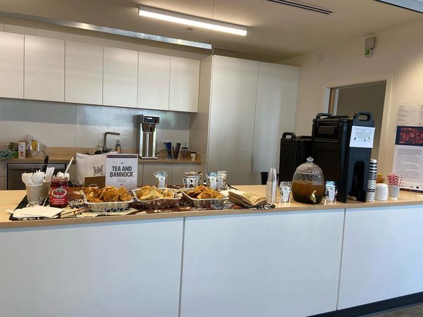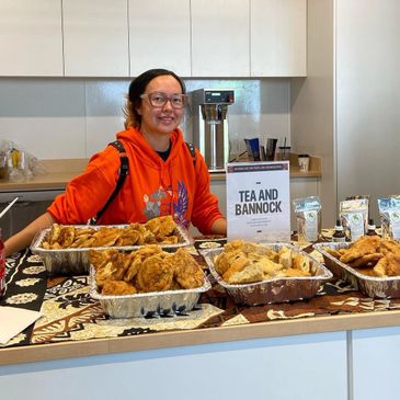 a Tea and Bannock Service at Arts Umbrella, September 30th 2022, Orange Shirt Day. Over 215 pieces of both baked and fried bannock served alongside Indigenous Herbal teas from Raven and Hummingbird Tea CO.