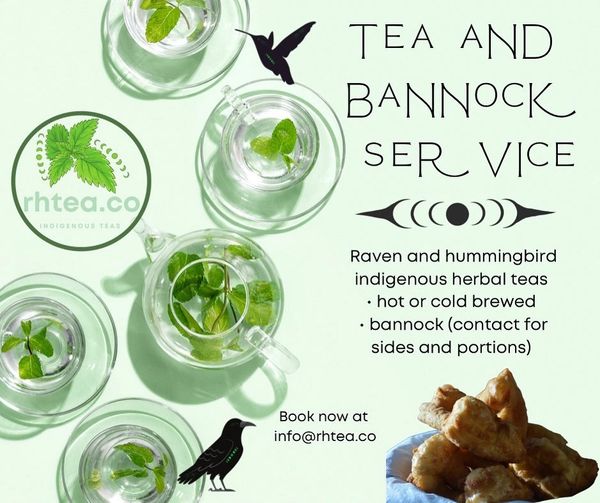 email info@rhtea.co for Tea and Bannock caring for large groups and functions. a Tea and Bannock Service both baked and fried bannock served alongside Indigenous Herbal teas from Raven and Hummingbird Tea CO.